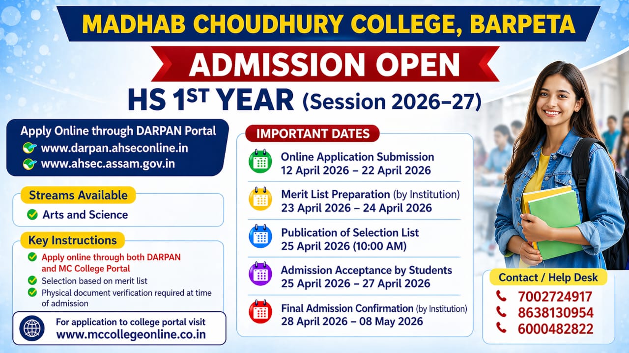 2026-04-22-HS 1st Year Notice Regarding Admission 2026-Click Here 2026-03-13-Notice Regarding Examination form fill up of B.A./B.Sc/B.Com & B.Voc TDC (CBCS) Semester-II (Arrear batches 2020, 2021 & 2022), Semester-IV (Arrear batches 2020, 2021 & 2022) and Semester-VI (Arrear b-Click Here 2026-03-13-Important Notice regarding Course Registration in Gauhati samarth for FYUGP 6th Sem students -Click Here 2025-12-06-ENROLLMENT NO. OF U.G 1ST SEM (SCIENCE) STUDENTS (B.U)-2025-Click Here 2025-12-06-ENROLLMENT NO. OF U.G 1ST SEM (ARTS) STUDENTS (B.U)-2025-Click Here 2025-12-06-EXAMINATION FORM FILL UP NOTICE FOR UG 1ST SEMESTER UNDER BHATTADEV UNIVERSITY REGULAR (2025 BATCH) & ARREAR(2024 BATCH)-Click Here 2025-12-06-INSTRUCTION FOR COURSE SELECTION AND EXAMINATION FORM FILL UP FOR UG 1ST SEMESTER REGULAR (2025 BATCH) & ARREAR (2024 BATCH).-Click Here 2025-11-22-Form Fill up notice for FYUGP 3rd sem(G.U) arrear examination for student who are currently in 5th semester 2023 batch-Click Here 2025-11-18-NOTICE REGARDING B.A/B.Sc U.G 3rd SEMESTER EXAMINATION FORM FILL UP UNDER B.U (REGULAR BATCH-2024 NEP)-Click Here 2025-10-23-Notice regarding CBCS Arrear form fillup 2025-Click Here 2025-10-17-Notice Regarding Examination form fill up of B.A./B.Sc TDC (CBCS) Semester-I (Arrear batch 2022), Semester-III (Arrear batch 2022) and Semester-V (Arrear batch 2022)-Click Here 2025-10-13-Notice Regarding Examination form fill up of B.A./B.Sc TDC (CBCS) Semester-I (Arrear batches 2020 & 2021), Semester-III (Arrear batches 2020 & 2021) and Semester-V (Arrear batches 2020 & 2021)-Click Here 2025-10-09-NOTICE REGARDING STUDENT UNION ELECTION FOR THE SESSION 2025-2026-Click Here 2025-09-08-H.S 2ND ARTS & SCIENCE UNIT TEST-Click Here 2025-09-08-FYUGP 1ST & 3RD SEM 1ST SESSIONAL EXAM-Click Here 2025-09-02-NOTICE REGARDING 1ST SESSIONAL EXAM OF FYUGP ODD SEMESTERS AND UNIT TEST OF HS CLASSES-Click Here 2025-08-18-ACADEMIC CALENDAR FOR SESSION 2025-26-Click Here 2025-08-11-NO SEAT VACANCY FOR THE FOLLOWING MAJOR SUBJECTS FOR FYUGP 1ST SEMESTER-Click Here 2025-08-11-NOTICE FOR MAJOR MINOR SUBJECT CHANGE FOR FYUGP 1ST SEMESTER-Click Here 2025-08-07-PG Merit list 2025 for Botany-Click Here 2025-08-04-LAST DATE FOR 5H SEMESTER ADMISSION FINAL NOTICE-Click Here 2025-08-04-PG ADMISSION NOTICE-Click Here 2025-08-02-GROUP DETAAILS FOR AEC/ VAC COURSES FOR BA AND BCA FYUGP 1ST SEM-Click Here 2025-08-02-GROUP DETAILS FOR AEC/ VAC COURSES FOR BSC FYUGP 1ST SEM-Click Here 2025-08-01-CLASS ROUTINE FYUGP 5TH SEM ARTS-Click Here 2025-08-01-CLASS ROUTINE FYUGP 5TH SEM SCIENCE-Click Here 2025-08-01-CLASS ROUTINE FYUGP 3RD SEM ARTS-Click Here 2025-08-01-CLASS ROUTINE FYUGP 3RD SEM SCIENCE-Click Here 2025-08-01-CLASS ROUTINE FYUGP 1ST SEM ARTS-Click Here 2025-08-01-CLASS ROUTINE FYUGP 1ST SEM SCIENCE-Click Here 2025-07-26-GIRLS HOSTEL ADMISSION SELECTION LIST-Click Here 2025-07-14-FYUGP 3rd Semester 2025 Admission Notice-Click Here 2025-07-02-NOTICE REGARDING 5TH SEMESTER ADMISSION -2025-Click Here 2025-06-19-HOSTEL ADMISSION: APPLY ONLINE https://mccollegeonline.co.in/-Click Here 2025-06-12-BDU FYUGP 1ST year 2nd Merit list 2025-26-Click Here 2025-06-12-BCA 2ND MERIT LIST-Click Here 2025-06-12-ARTS 2ND MERIT LIST-Click Here 2025-06-12-SC. 2ND MERIT LIST-Click Here 2025-06-03-COMBINED ROUTINE FOR FYUGP 2ND SEM ( UNDER BDU), FYUGP 4TH SEM ( UNDER GU) AND CBCS 4TH SEM ARREAR ( UNDER GU)-Click Here 2025-06-02-1st Merit List BCA 1st Sem-Click Here 2025-06-02-1st Merit List of FYUGP B.A. 1st Sem-Click Here 2025-06-02-1st Merit List of FYUGP B.Sc 1st Sem-Click Here 2025-05-29-Notice for FYUGP 2nd Semester form fill up under BDU.-Click Here 2025-05-21-Important Dates for FYUGP 1st sem admissions-Click Here 2025-05-21-FYUGP 4th semester 2024-25 formfill up notice -Click Here 2025-05-20-NOTICE REGARDING AEC PAPER OF FYUGP 4TH SEMESTER 2024-25-Click Here 2025-05-16-Subject updation Notice for FYUGP 4th Semester 2025-26 -Click Here 2025-05-10-NOTICE REGARDING EXAMINATION FORM FILL UP ,2025 FOR FYUGP II SEMESTER (ARREAR BATCH 2023) UNDER GAUHATI UNIVERSITY-Click Here 2025-05-08-WAITING LIST FOR HS ADMISSIONS 2025( ARTS AND SCINCE)-Click Here 2025-05-08-MERIT LIST FOR HS ADMISSIONS 2025( ARTS AND SCINCE)-Click Here 2025-05-08-Merit list for HS 2025-26 Reserve Category-Click Here 2025-05-08-HS 2025-26 Reserve Catagory -Click Here 2025-05-08-General Merit list for Science HS 2025-26-Click Here 2025-05-08-HS 1ST YEAR MERIT LIST FOR GENERAL-Click Here 2025-04-25-REVISED NOTICE REGARDING B.A./B.Sc. (CBCS) EXAMINATION FORM FILL UP, 2025 FOR 2ND SEM (ARREAR BATCH-2022) , 4TH SEM (ARREAR BATCH-2022) AND 6TH SEM (REGULAR BATCH -2022)-Click Here 2025-04-24-Notice Regarding Admission to HS Course 2025-Click Here 2025-04-22-Arrear Form fill up notice-Click Here 2025-04-12-ADMISSION NOTICE FOR H.S. 1ST YR. (ARTS & SCIENCE) FOR THE SESSION 2025-26-Click Here 2025-04-03-FYUGP 4TH SEMSETER SUBJECT DETAILS AS PER SAMARTH-Click Here 2025-01-01-Notice Regarding Examination form fill up of Semester-I FYUGP (Arrear Batch 2023)-Click Here 2020-06-09-Dress Code for the students -Click Here